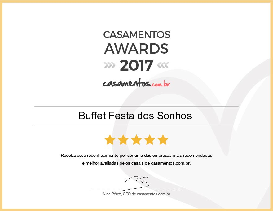 Juiz de Fora, 08 de Abril de 2017. – Buffet Festa dos Sonhos por mais um ano foi premiado com prêmio Casamentos Awards 2017 para a categoria Buffet. Faz dois anos, Casamentos.com.br concede estes prêmios pela excelência no serviço oferecido por empresas nupciais do nosso país.